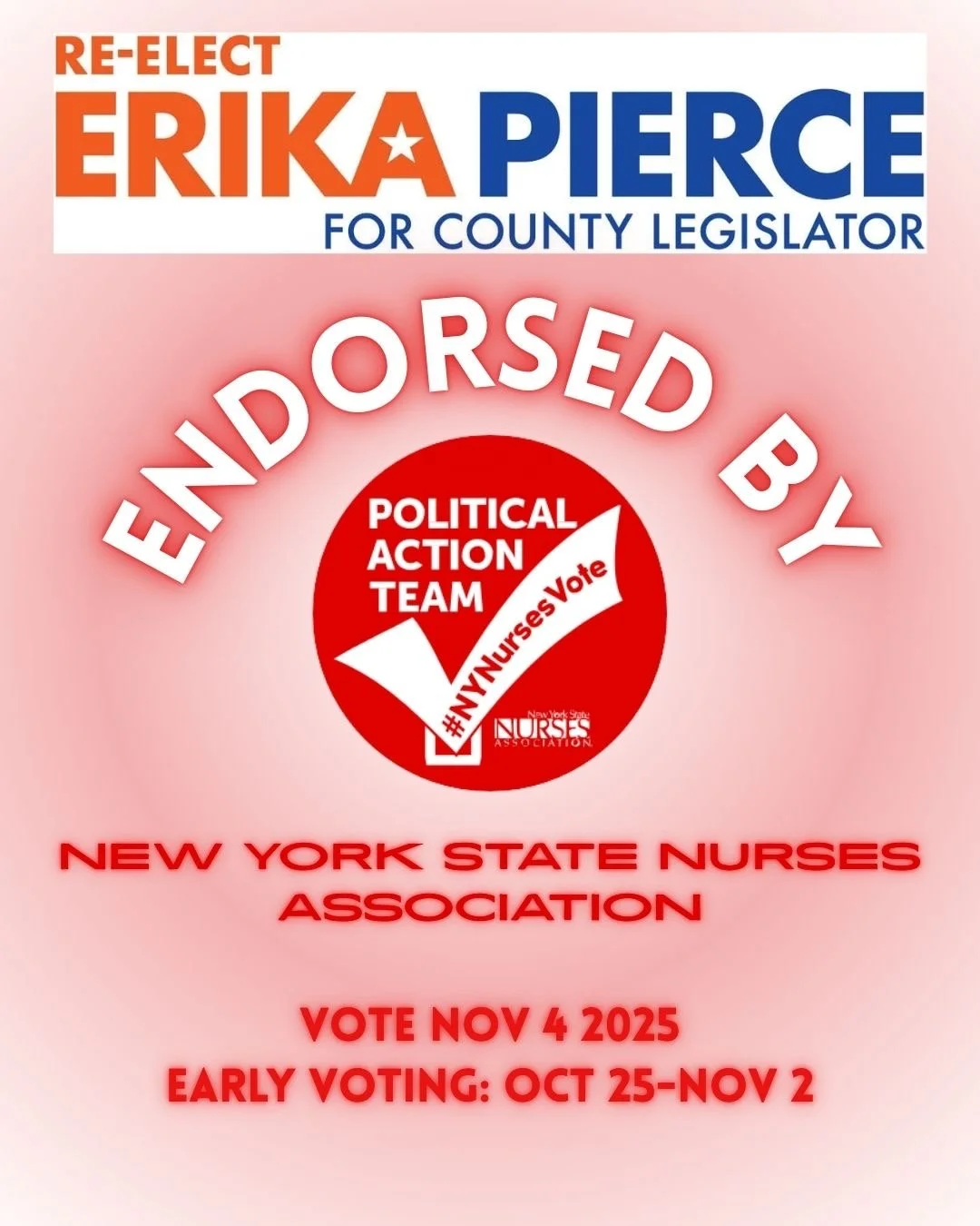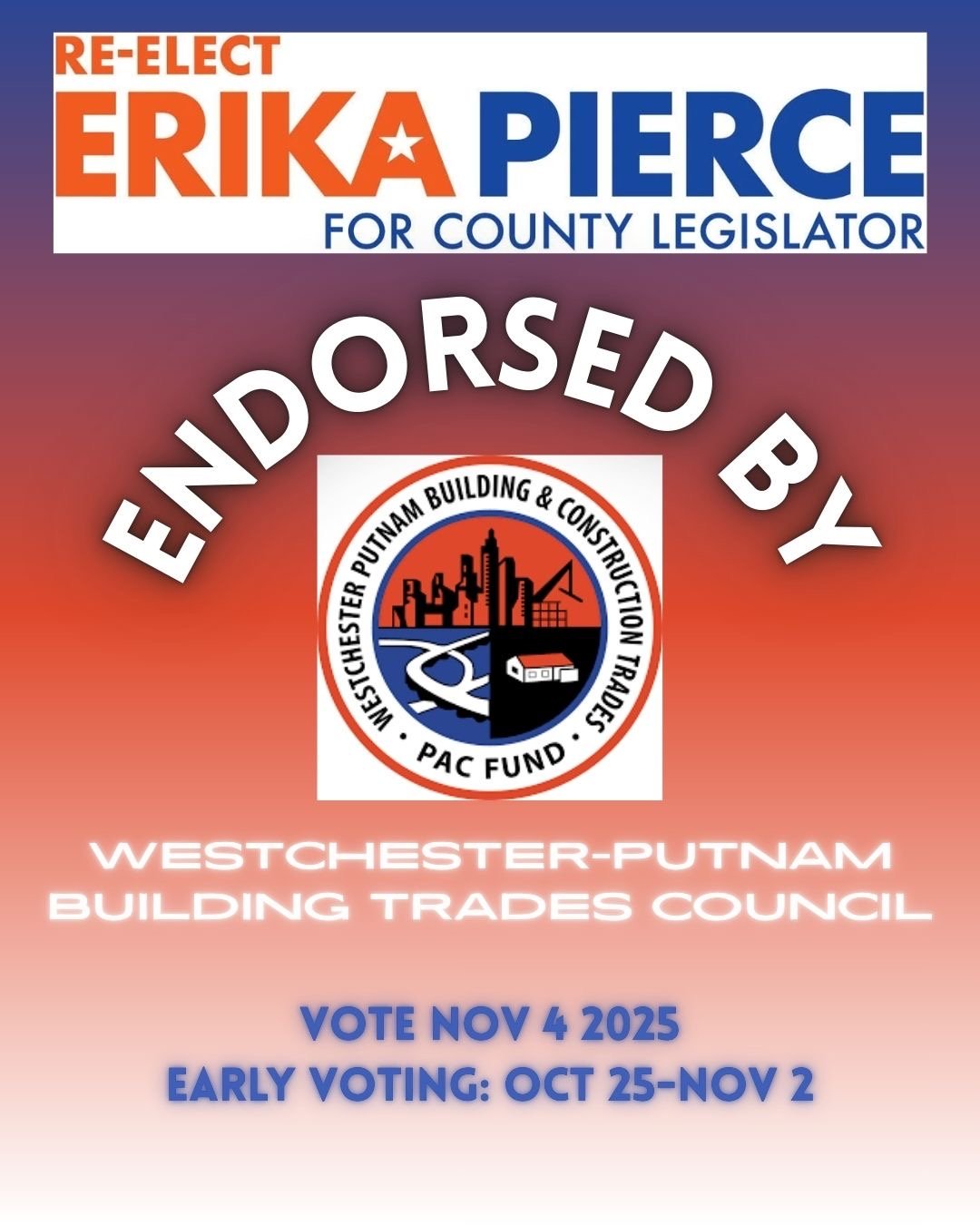 “Erika is a partner I need in County Government. She has proven her leadership on the environment, on the opioid crisis, on behavioral health issues and especially on Indian Point. So on election day please vote for my friend Erika Pierce.”